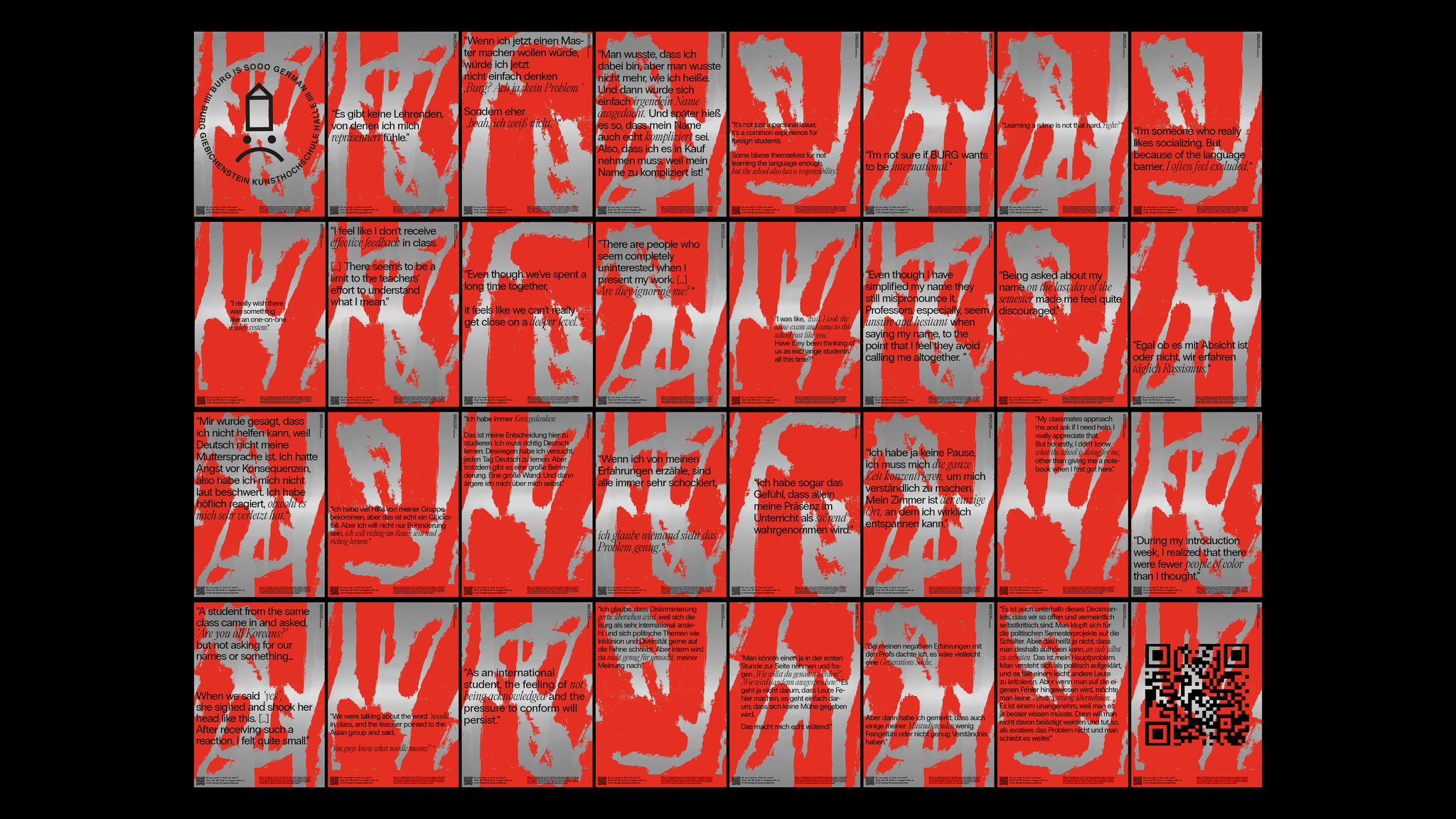 Das Projekt beleuchtet die strukturelle Diskriminierung internationaler Studierender: Eine wöchentliche Talk-Reihe gibt marginalisierten Stimmen Raum, während ausdrucksstarke Zitate als Plakat- und Webkampagne irritieren, sensibilisieren und zum Umdenken anregen. So wird Design zur Bühne für Vielfalt, treibt die Debatte über Inklusion und Weltoffenheit in der Hochschulbildung voran und setzt ein klares Signal gegen Diskriminierung.