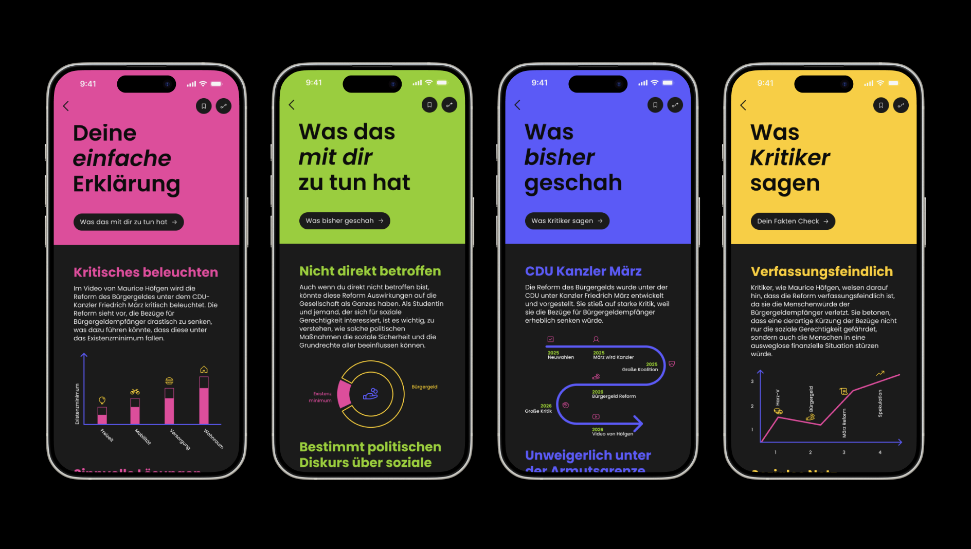 Die Studierenden widmen sich dem Thema politischer Meinungsbildung und machen es für eine junge Zielgruppe zugänglich. Ihre App ist gestalterisch konsequent auf diese Zielgruppe zugeschnitten und rückt die Vielfalt individueller Meinungsbildungsprozesse visuell einprägsam in den Mittelpunkt. In der Kommunikation ihrer Arbeit treten die Gestalter*innen bewusst in den Hintergrund – ihr Ziel ist es, ein neutrales Angebot zu schaffen, das jungen Menschen in politisch unsicheren Zeiten hilft, eine eigene Position zu finden.