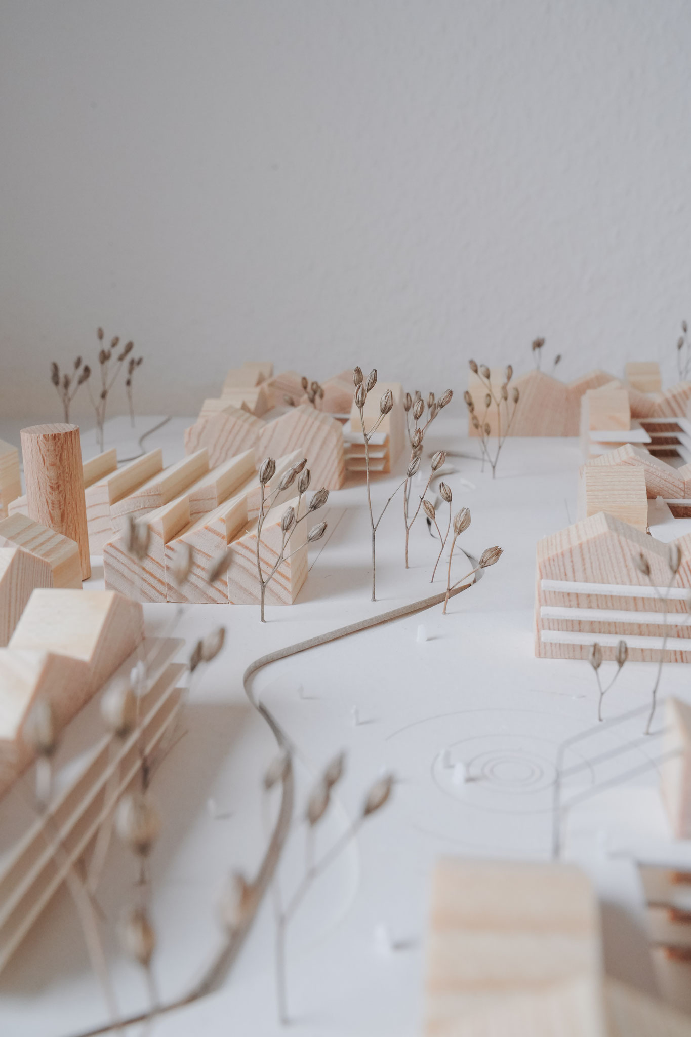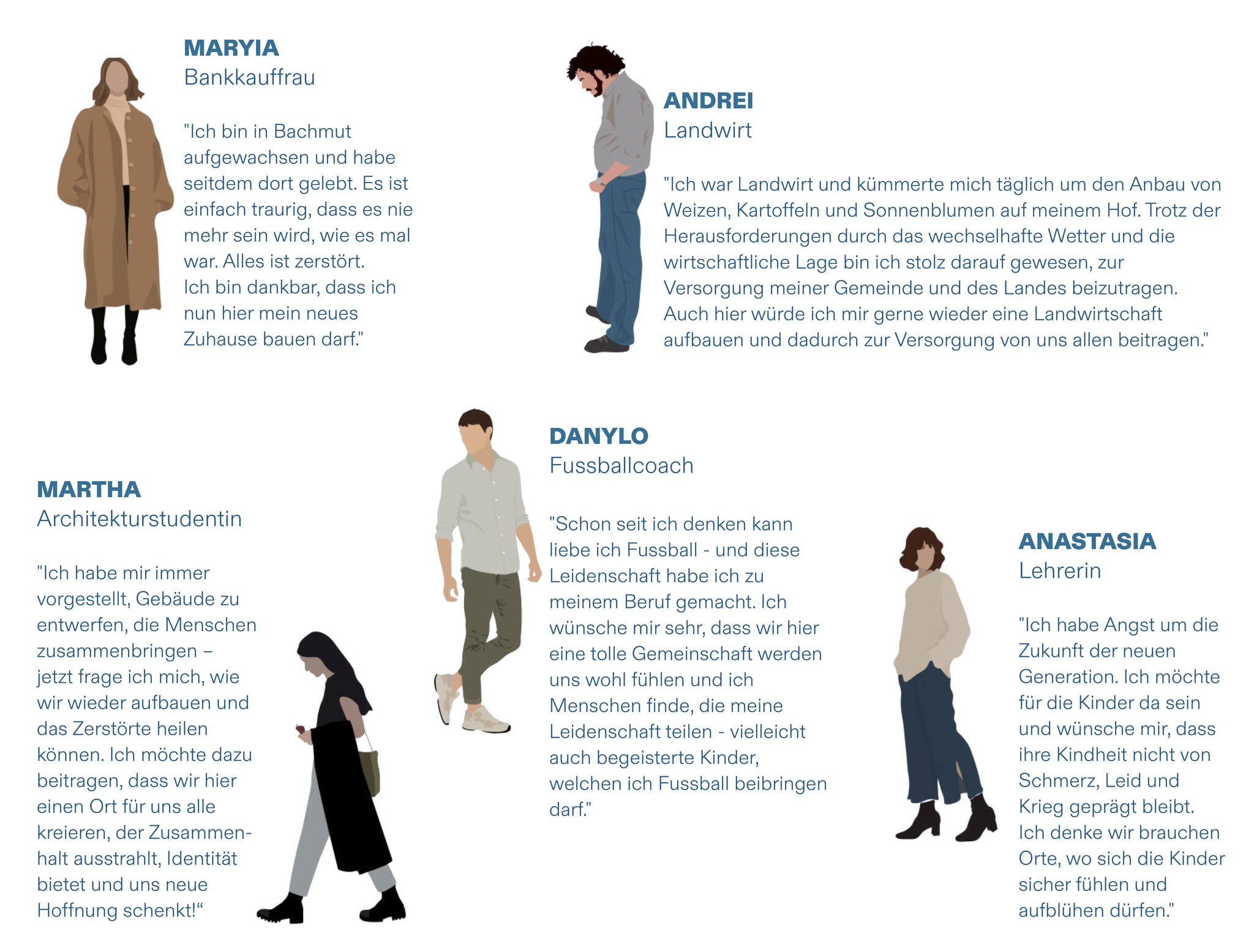 Der Beitrag wurde inspiriert von einem Gespräch mit Genya Moore (HFT) und ihrer Initiative Real LiveUkraine. Die Verfasserin möchte einen Beitrag leisten zu Möglichkeiten des Wiederaufbaus in der Ukraine und setzt sich insbesondere mit der Verbindung von Wohnen und Arbeit auseinander. Errichtet werden hier flexible und modulare Gebäude, welche in gemeinschaftlichen Zusammenbau gefertigt werden, um Begriffe wie Identität und Heimat wieder zu stärken. Themen wie gemeinsame Arbeit oder Aneignung handwerklicher Fähigkeiten sollen dabei aktiv einen Beitrag leisten zur Traumabewältigung.
